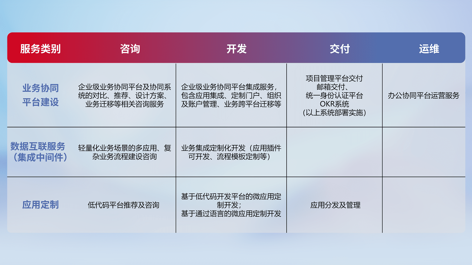 针对钉钉、、、、企微、、、IDaas等平台级产品提供产品的规划、、方案、、、交付、、、定制化开发等服务,,,,实现如统一协同办公、、、、智能客户服务、、混合会议管理、、、智能数据查询、、、等业务场景,,,实现数字化转型。。。